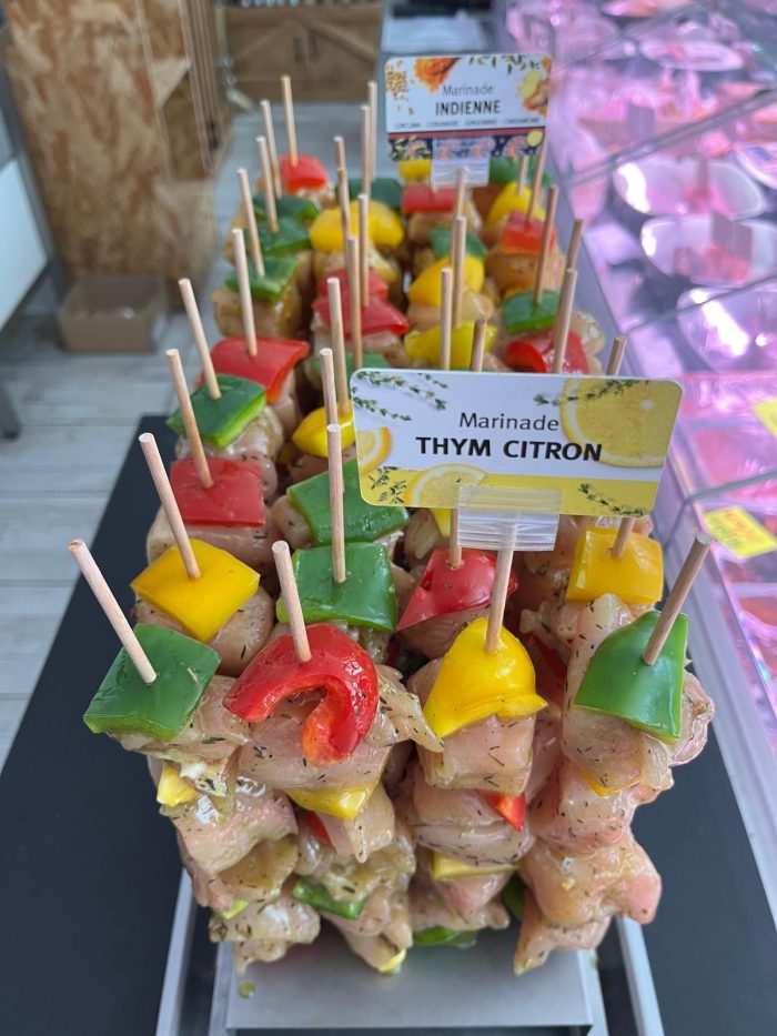 Pour vos repas en extérieur ou vos soirées grillades, nos brochettes de poulet marinées sont prêtes à cuire. Les morceaux de volaille, soigneusement sélectionnés, sont marinés plusieurs heures dans un mélange d’huile d’olive, d’épices et d’herbes fraîches.